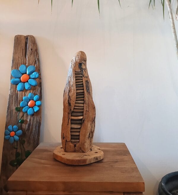 Sculpture en Bois Flotté avec des galets Dimensions: H-42cm, L-12cm, Poids: 1,7 Socle on bois de TECK
